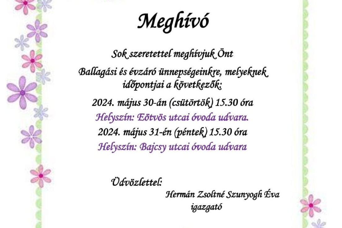 Sok szeretettel meghívjuk Önt ballagási és évzáró ünnepségeinkre.