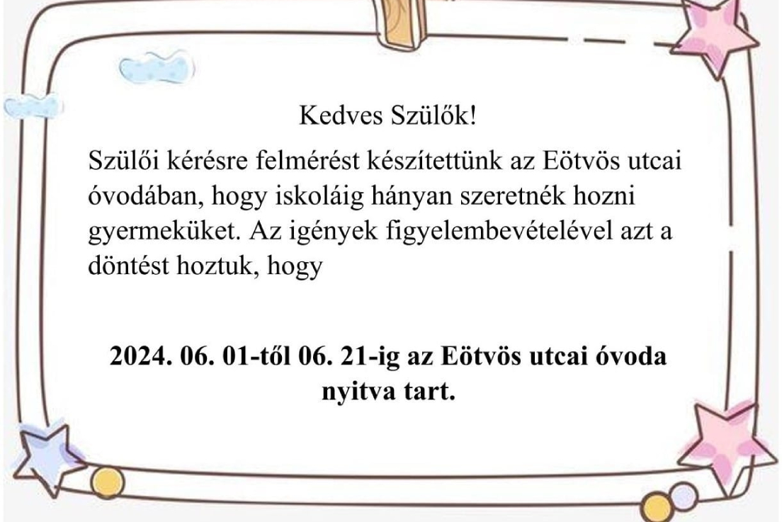 Kedves Szülők! Az Eötvös utcai óvoda 2024.06.01-től 06.21-ig nyitva tart!